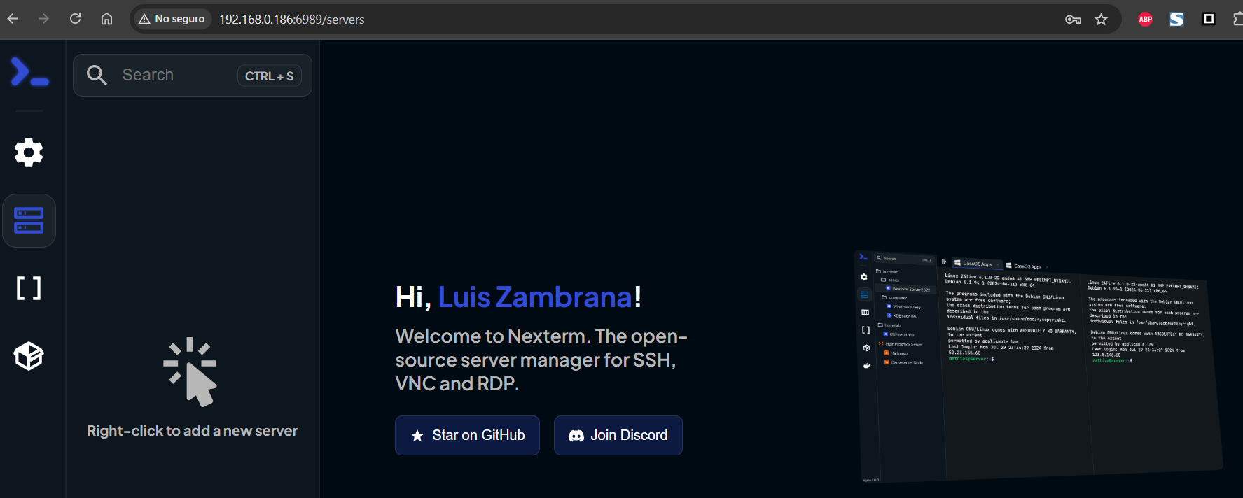 En esta oportunidad te voy a contar de Nexterm, una linda herramienta opensource que nos ayudará a administrar equipos desde diferentes protocolos. Sin poder decirlo aún pero si a simple vista, tiene una version más amigable que Apache Guacamole, si utilizas como distribución de tu notebook tanto sea linux como windows con docker podes reemplazar a putty y/o termius con esta herramienta que la verdad ya vas a ver es muy versatil y bonita.
