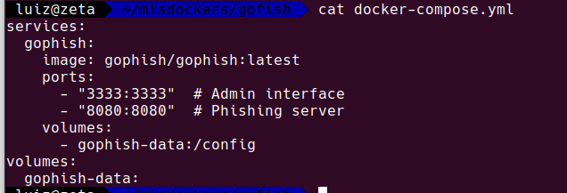 Como ven en la siguiente imagen en una carpeta que llame gophish cree un archivo docker-compose.yml y le puse el siguiente contenido: