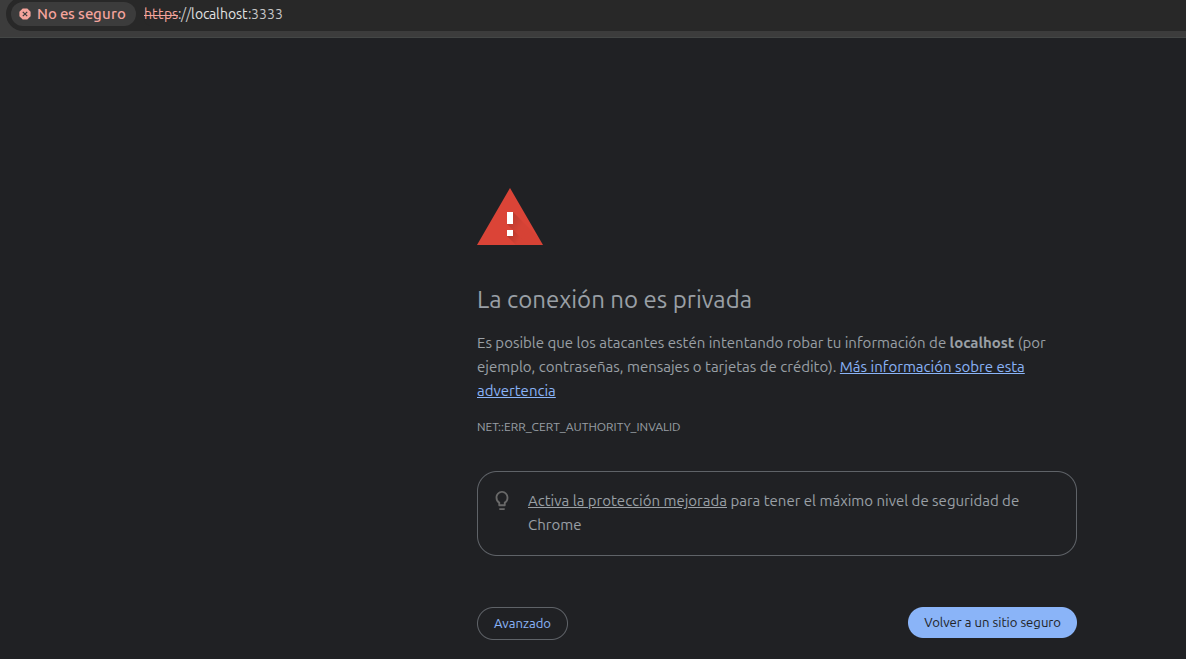 Con esto si esperamos unos segundos encontraremos en nuestro localhost:3333 el servicio funcionando. Como en mi caso te puede decir que no es seguro por que falta el ssl (no es cuestion de este tutorial ni es tan necesario si es algo interno)