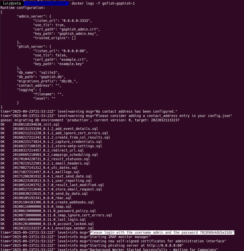 Importante: podes fijarte como se llama tu contenedor en el caso de que el comando de error y no se llame estrictamente gofish-gophish-1