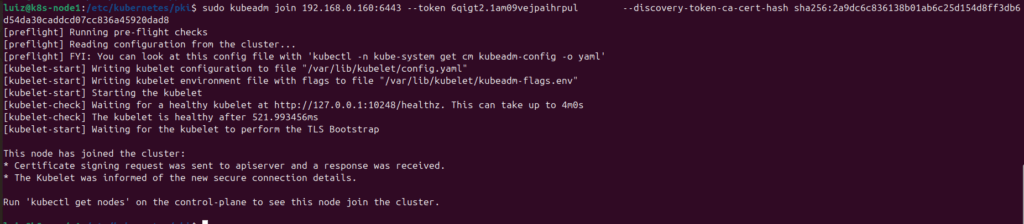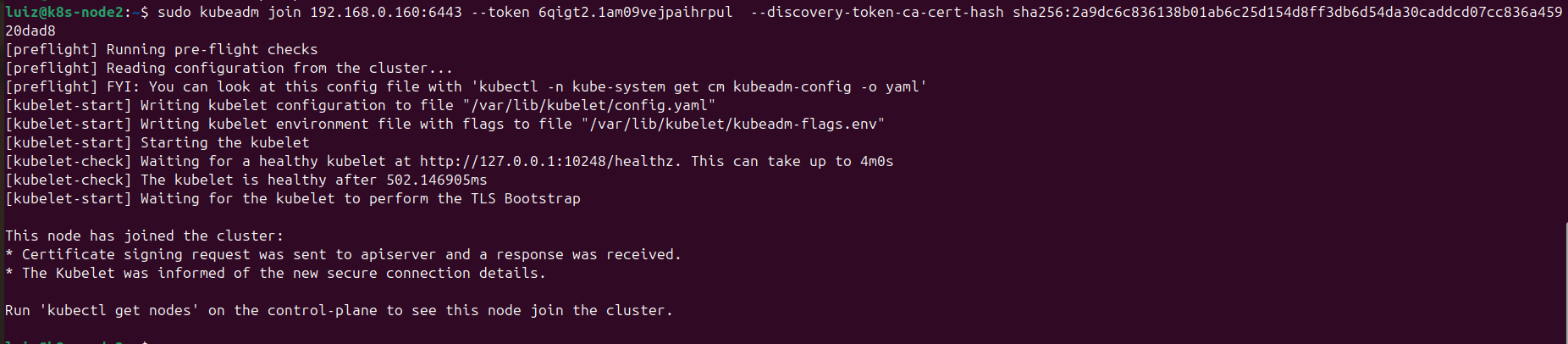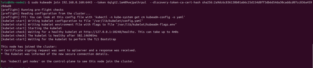 Y ahora si, vamos a ingresar a los workers o sea al 192.168.0.161 y al 192.168.0.162 y los vamos a unir al cluster. Para eso, si te acordas que arriba te dije «guardate esto en un bloc de notas» es momento de usarlo: