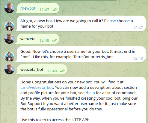Como se puede apreciar en la imagen anterior elegi como nombre del bot webzeta, y como usuario webzeta_bot y ahi mismo te vuelve un DONE! lo crea de toque y te despues tambien fijate que dice: Use this token to access the http api………. lo que sigue es el token que te da acceso a las funcionalidades.