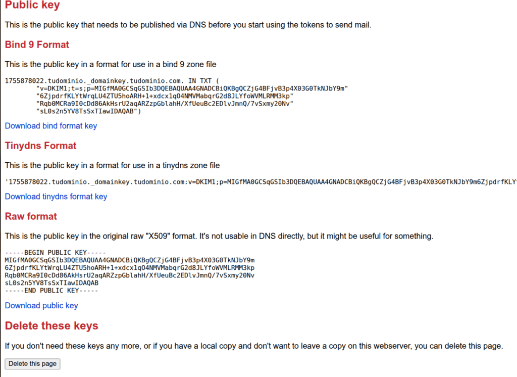 Aca una nota importante: Hay generadores web que te permiten generar las claves pero que a su vez te indican «si la generaste con esta web preciona BORRAR ESTA PAGINA» al menos si es una herramienta seria como https://dkimcore.org/tools/keys.html