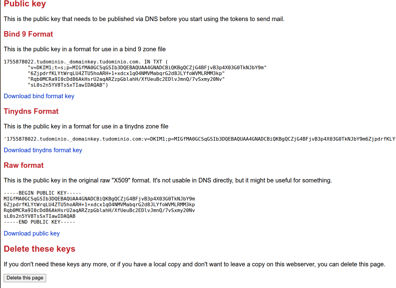 Aca una nota importante: Hay generadores web que te permiten generar las claves pero que a su vez te indican «si la generaste con esta web preciona BORRAR ESTA PAGINA» al menos si es una herramienta seria como https://dkimcore.org/tools/keys.html