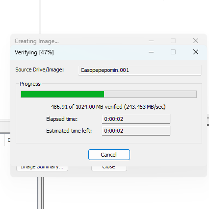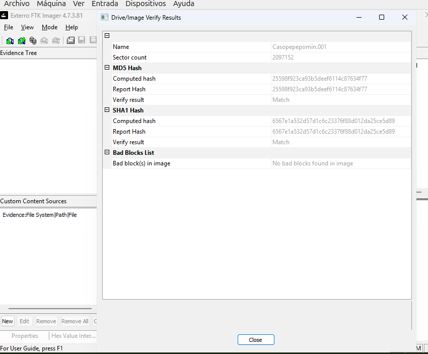 Al terminar veremos que nos da información que deberia ir directamente a la planilla de cadena de custodia. Si bien md5 ya no se usa la idea de la combinación es dos hash es correcta.