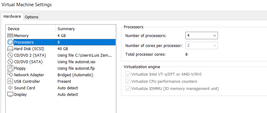 Esto quiere decir que la maquina virtual esta usando 4 procesadores y 2 cores por procesador (una maquina virtual bastante grande para jugar), tenemos tildadas todas las opciones de virtualizacion. Y ahora si al ejecutar el codigo anterior veremos una respuesta diferente: