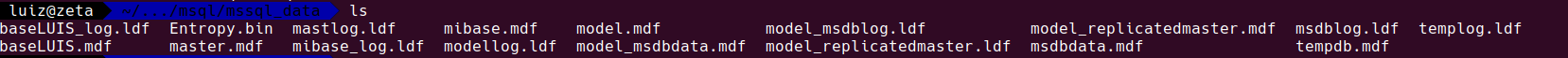 COmo pueden ver con el administrador de bases de datos cree dos bases (baseLUIS y mibase) y si en una terminal vamos hacia el volumen donde estan las bases de datos que segun nuestro docker-compose.yml se llama mssql_data veremos los archivos que «son» nuestras bases creadas y que tenemos dando vuelta en el servidor.