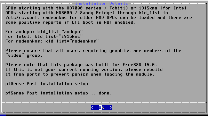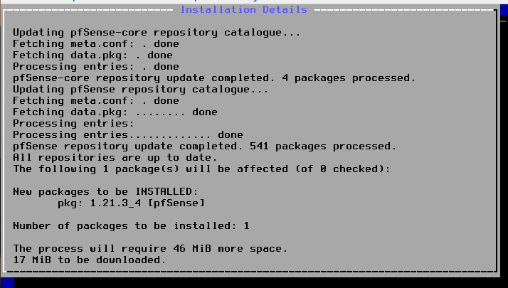 En esta pantalla parece que «se cuelga» pero no es asi, baja directamente del servidor paquetes necesarios con lo cual va a depender de la conexion de internet que tengan uds y la disponible que tenga netgate en ese momento, a veces demora «bastante» pero termina!!