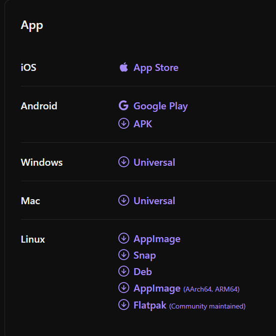 Pero para el resto de los usuarios de linux lo bueno es que tambien cuenta con otros tipos de paquetes como AppImage, Flatpak y Deb.