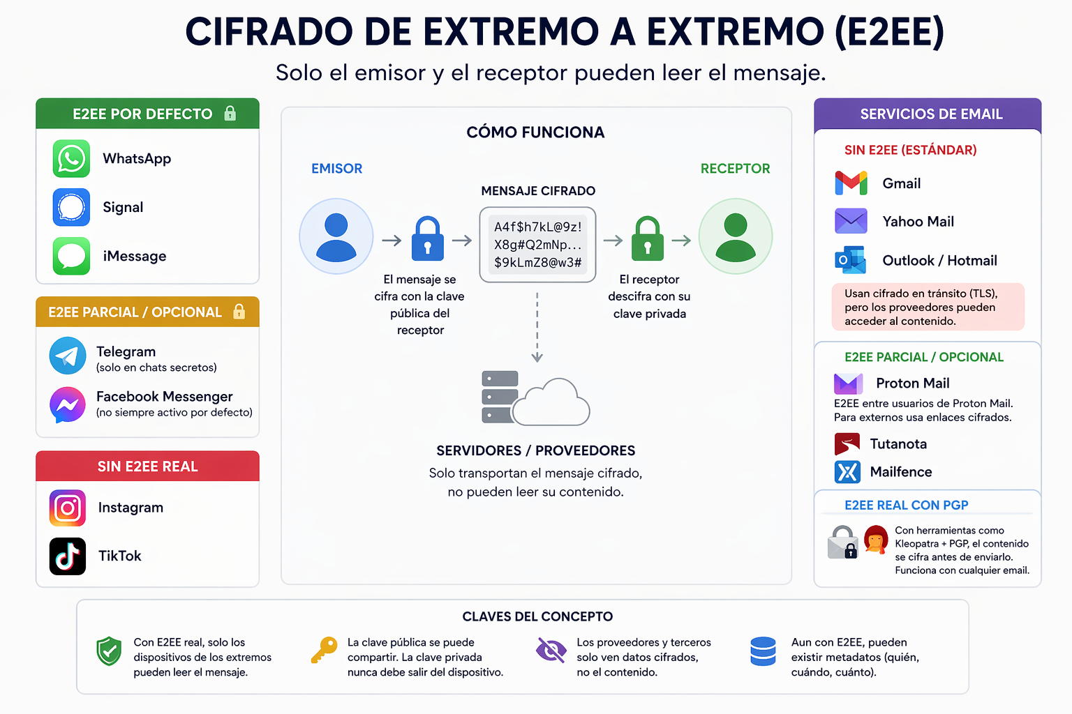 Qué servicios realmente protegen tus mensajes, cuáles no, qué información sigue siendo visible y cómo aplicar cifrado real en la práctica con tus propias claves.