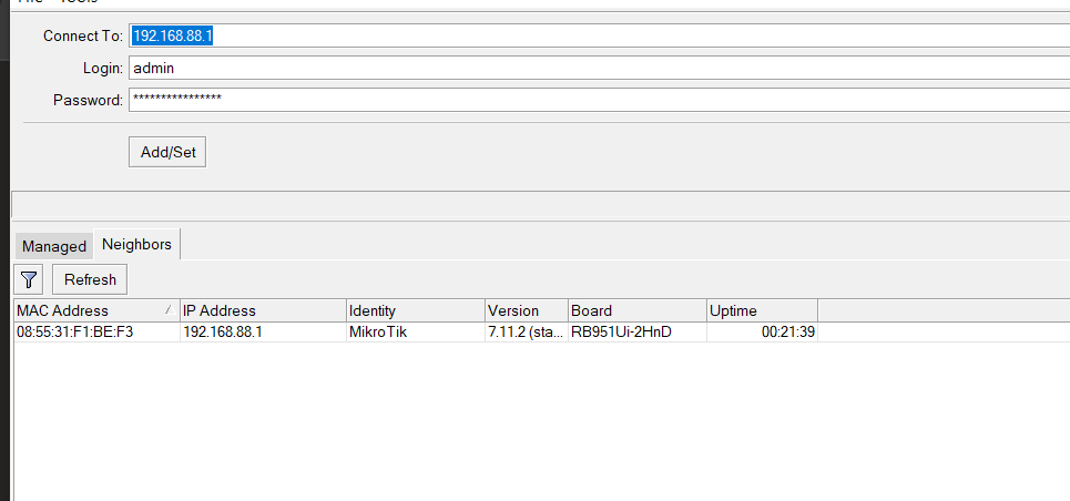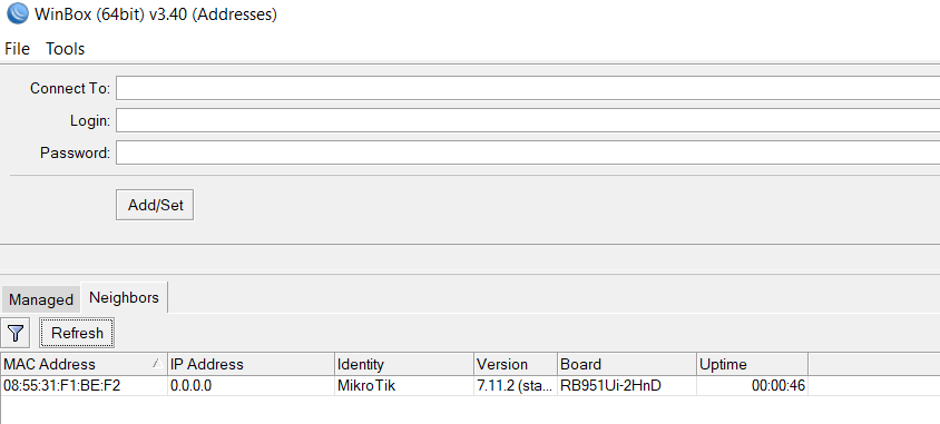 Es hora de abrir winbox y luego veremos la solapa Neighbors (vecinos). Lo que hace winbox es descubrir todos los mikrotiks conectados a la red en la que estoy.