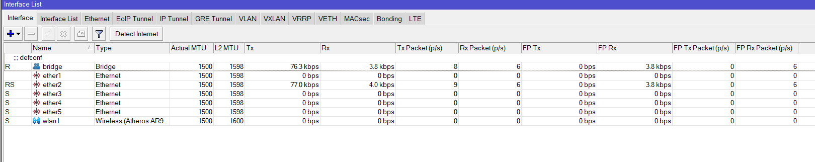 Ether1 – Ether2 – Ether3 -Ether4 – Ether5 y wlan1 son las interfaces fisicas del router mikrotik.