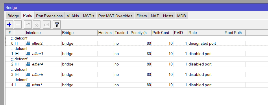 Aca ya podemos decir que desde el ether2 al ether5 más la wlan1 son parte del bridge (puente), o sea virtualmente estan conectadas. Y como somos re grosos nos hacemos la siguiente pregunta: ¿Si me conecto a la wifi o a cualquiera de estos puertos obtendre una ip del mismo rango de red? y la respuesta es SI! pero… ¿Por que? y acá viene lo mejor.