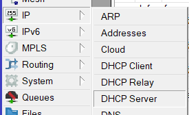 Recordamos que para que la red tenga una configuración para brindar a los que se conecten se necesita un DHCP SERVER, entonces vamos al menú IP -> DHCP Server: