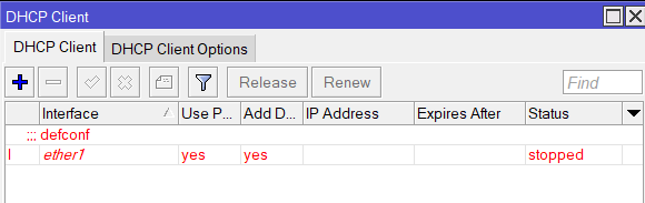 Claro! el dhcp client esta configurado en la interface ether1 y como se ve «está todo en rojo» y dice stopped. No esta funcionando!