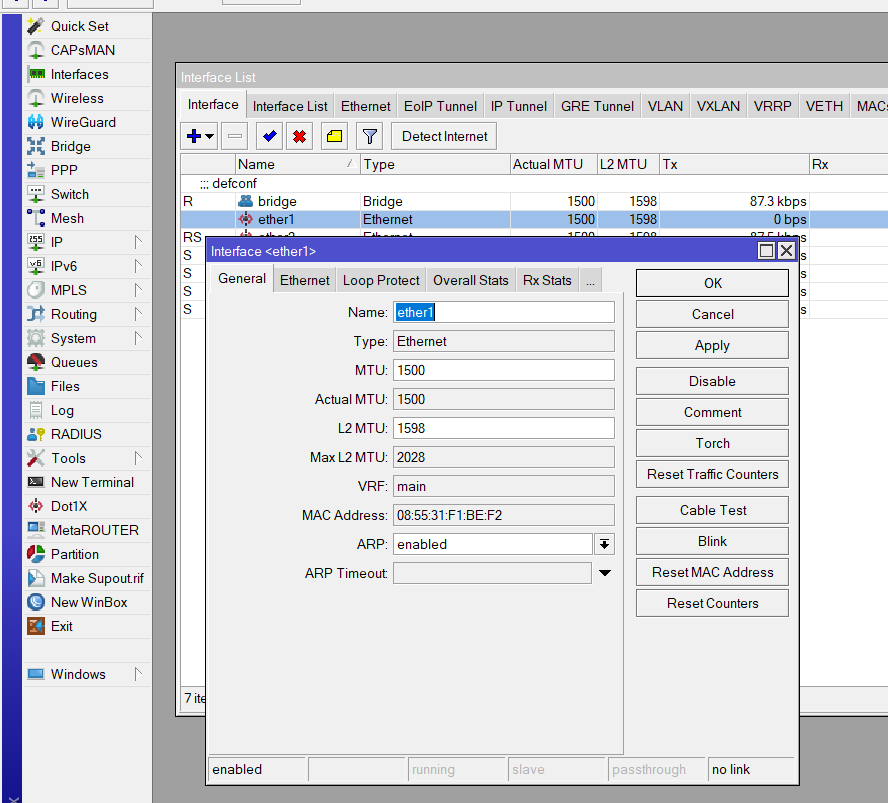 ¿Y que es lo primero que haria un tecnico cuando ve que ether1 no esta funcionando? ir a la interface ether1. Vamos al menú Interfaces – le damos doble clic a ether1 y veremos: