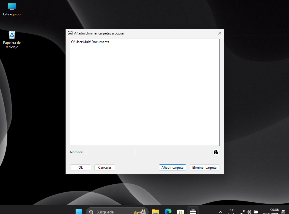 Aca vas a Añadir Carpeta y elegis las carpetas (una en una) las que queres que se haga backup (como es una maquina virtual elijo mis documentos normalsito no mas)