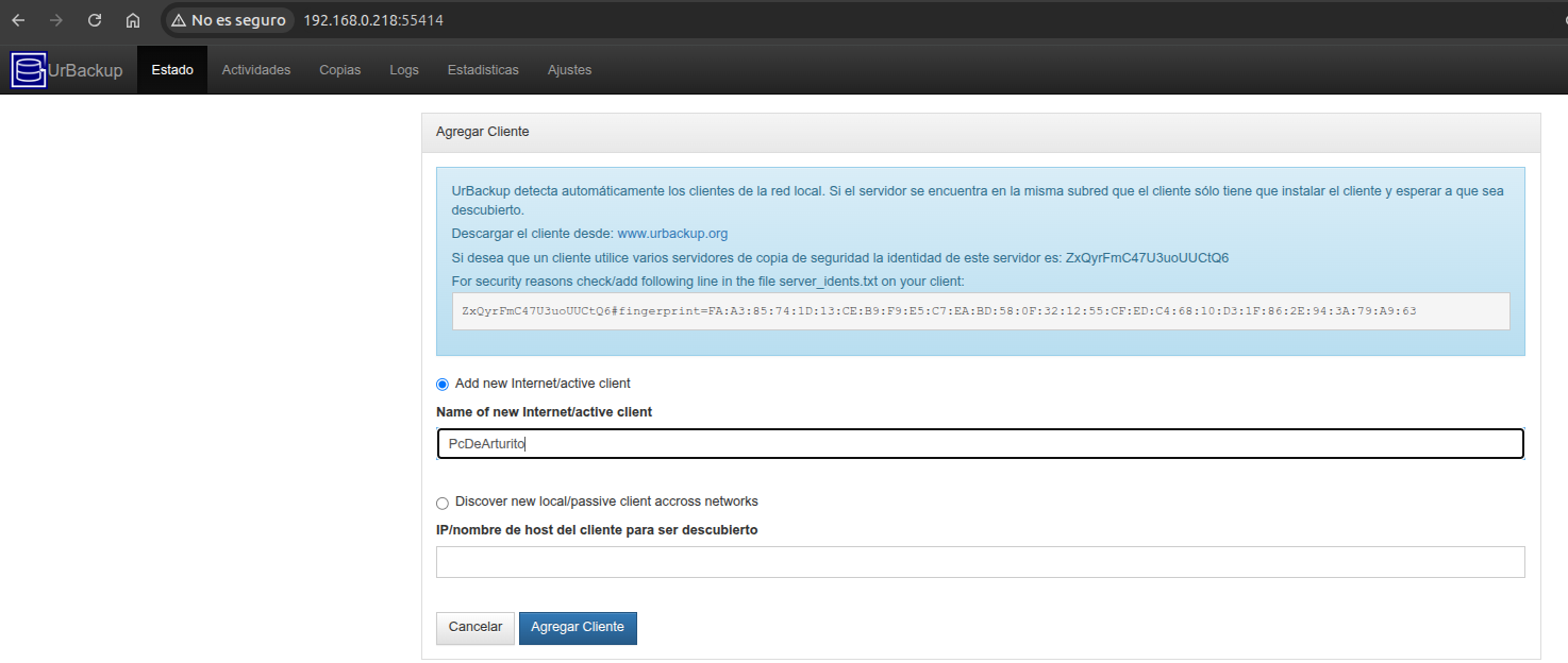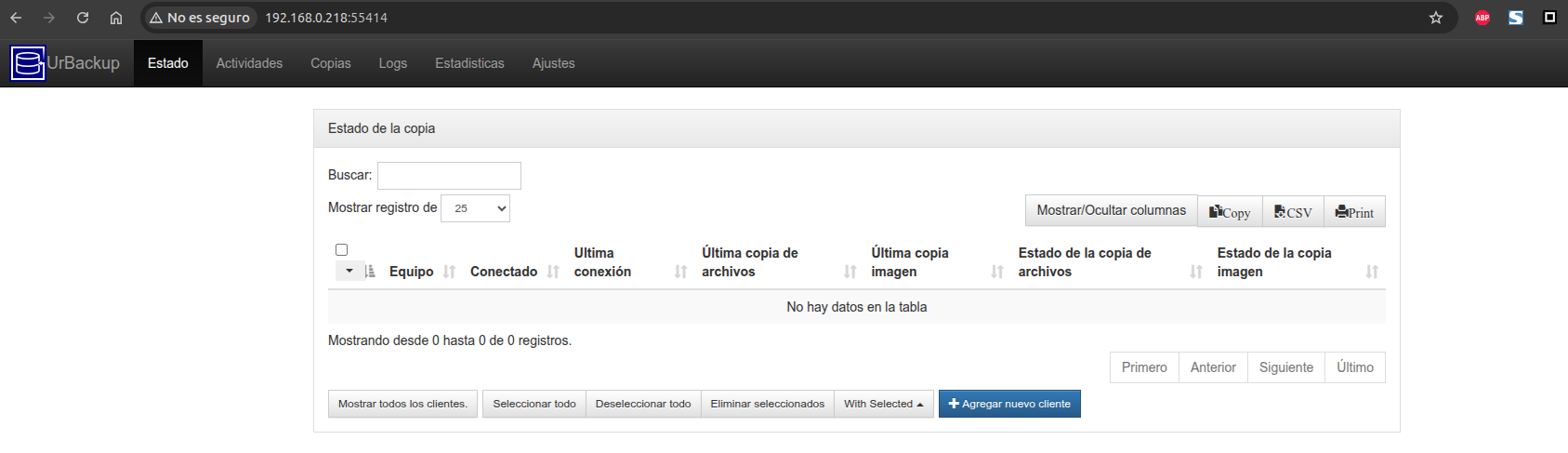 Ahora sabiendo la ip del servidor donde instalamos urbackup mas el puerto 55414 veremos: