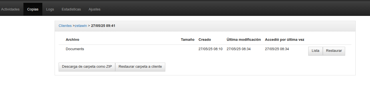 Vemos que tenemos la accion de restaurar, hacer clic sobre LISTA y ver los archivos backapeados, descargar la carpeta como zip! Sea lo que sea, si sos syadmin en una empresa ojala tengas un acuerdo de confidencialidad firmado por que aca es donde muchos la pudren!